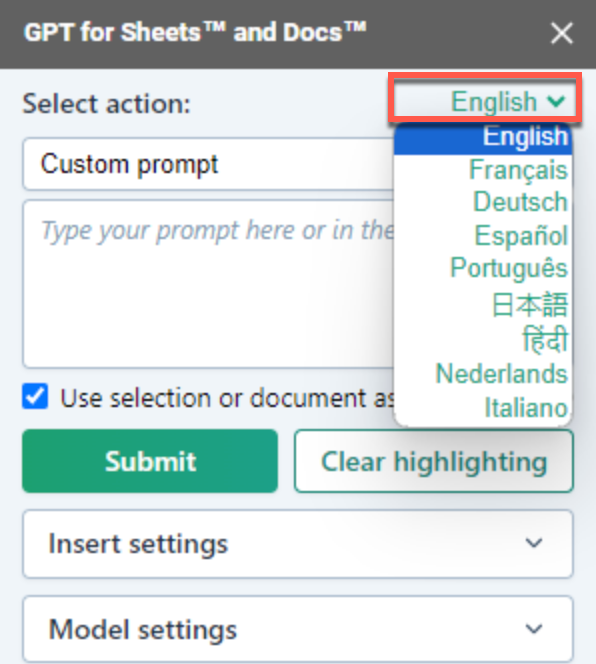 You can now submit a prompt in the current document with the selected prompt language. Once a prompt is submitted, the prompt language is saved along with all Model settings values, and is used for all prompts executed from Google documents.
