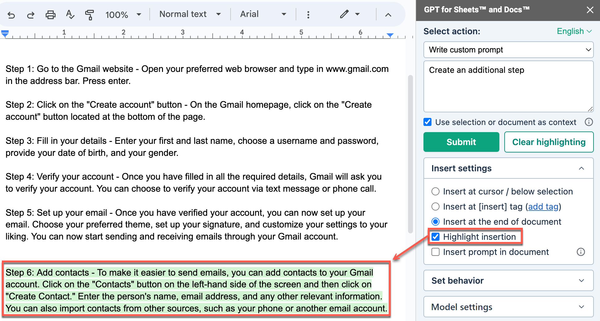 When you select Highlight insertion, GPT for Docs highlights the generated response in green in your document.