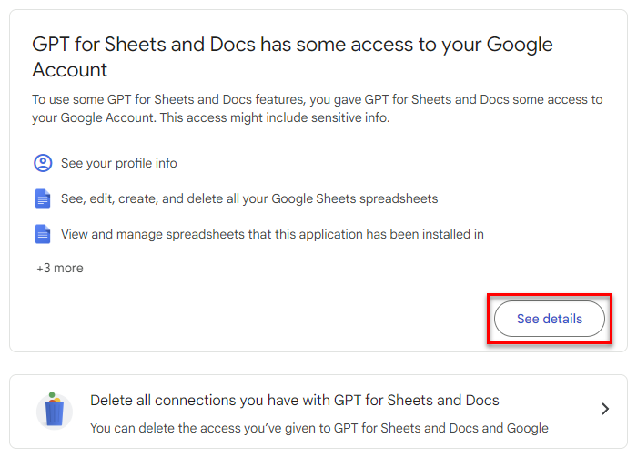 In the GPT for Sheets and Docs has some access to your Google Account section, click See details.