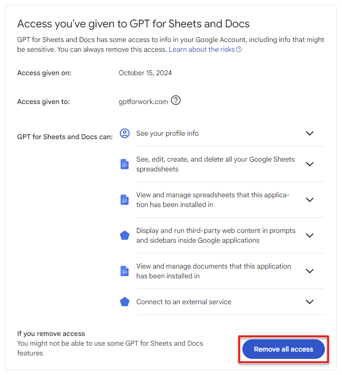 The GPT for Sheets and Docs add-on no longer has access to your Google account.