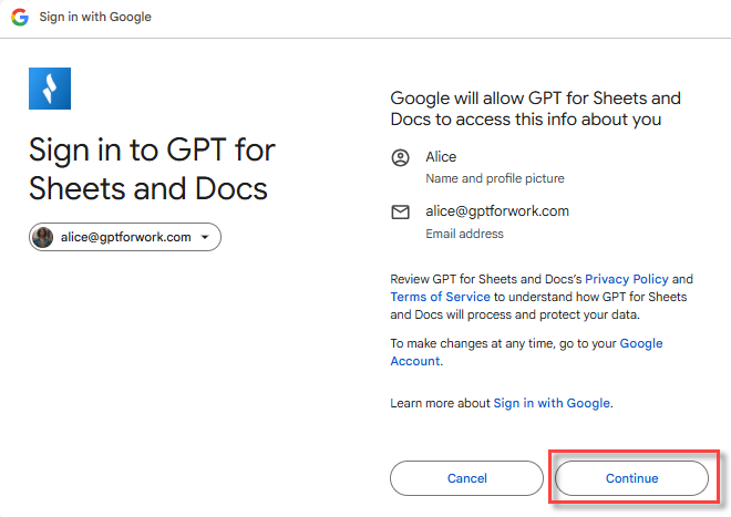 4. Select for which Google account you want to install GPT for Sheets and Docs.